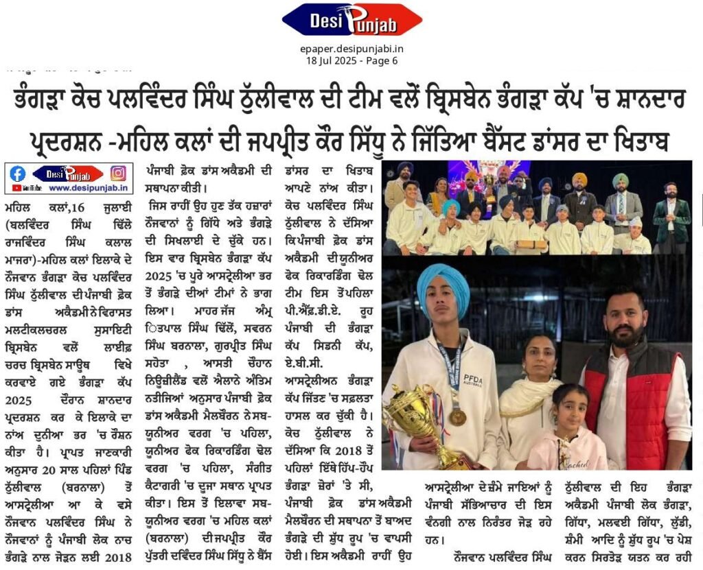 Led by Coach Palwinder Thuliwal, our academy offers expert instruction in: Traditional Bhangra Folk dance forms including Luddi and Jhoomer Cultural performance arts Traditional music appreciation with world-renowned Dhol player Ustad Balbir Singh Ghanot